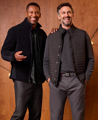 Two men standing side by side against a wooden wall, wearing matching dark gray outfits. Collage of a man in different outfits in various settings